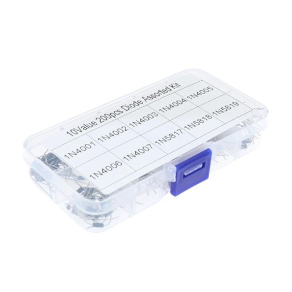 Incluye 10 modelos populares de diodos, tanto diodos rectificadores estándar (1N400x) como diodos Schottky (1N581x), todos organizados en una práctica caja con compartimentos individuales para rápida identificación y fácil acceso.